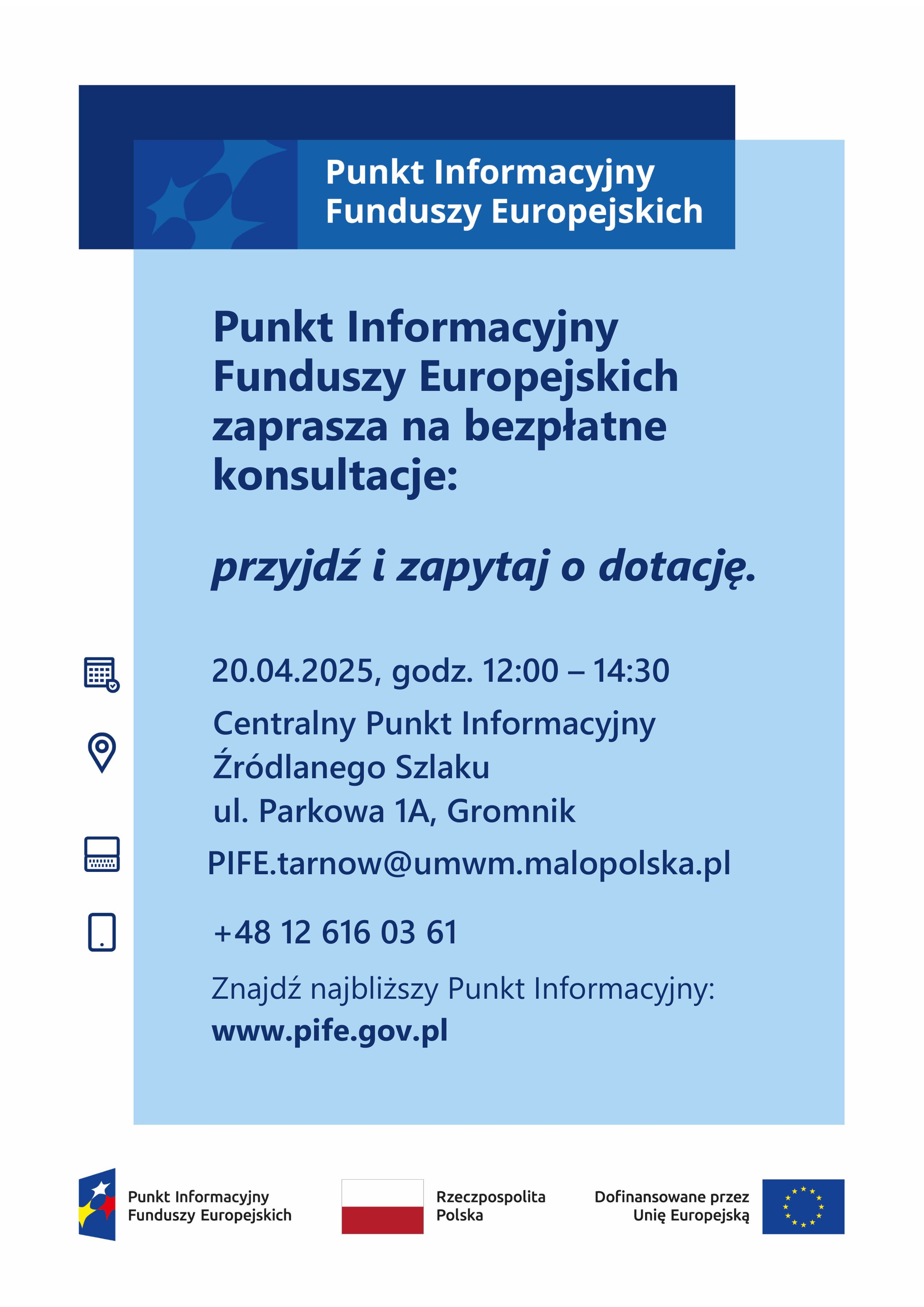 Specjaliści z Punktu Informacyjnego Funduszy Europejskich w Tarnowie zapraszają na bezpłatne konsultacje indywidualne dotyczące funduszy unijnych.